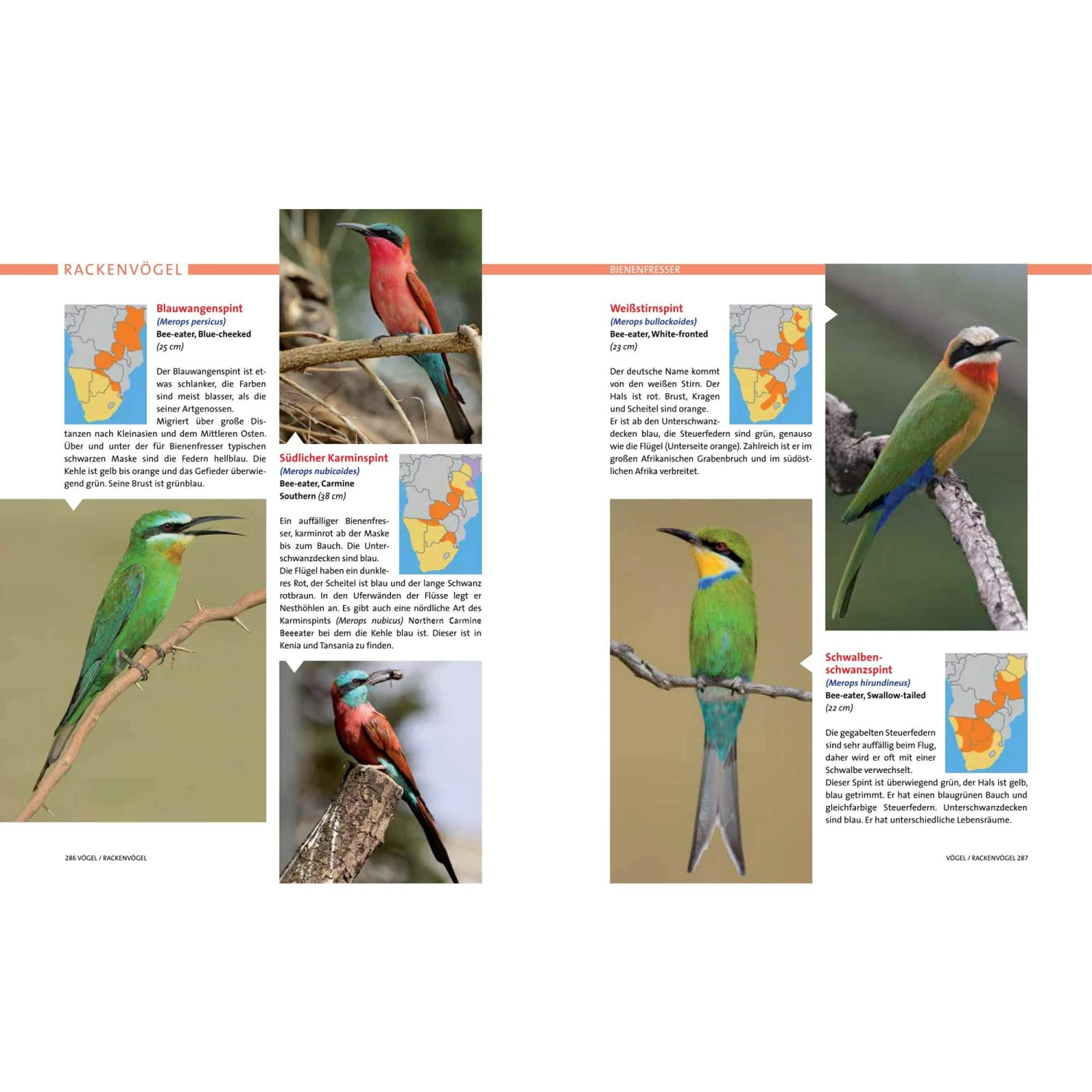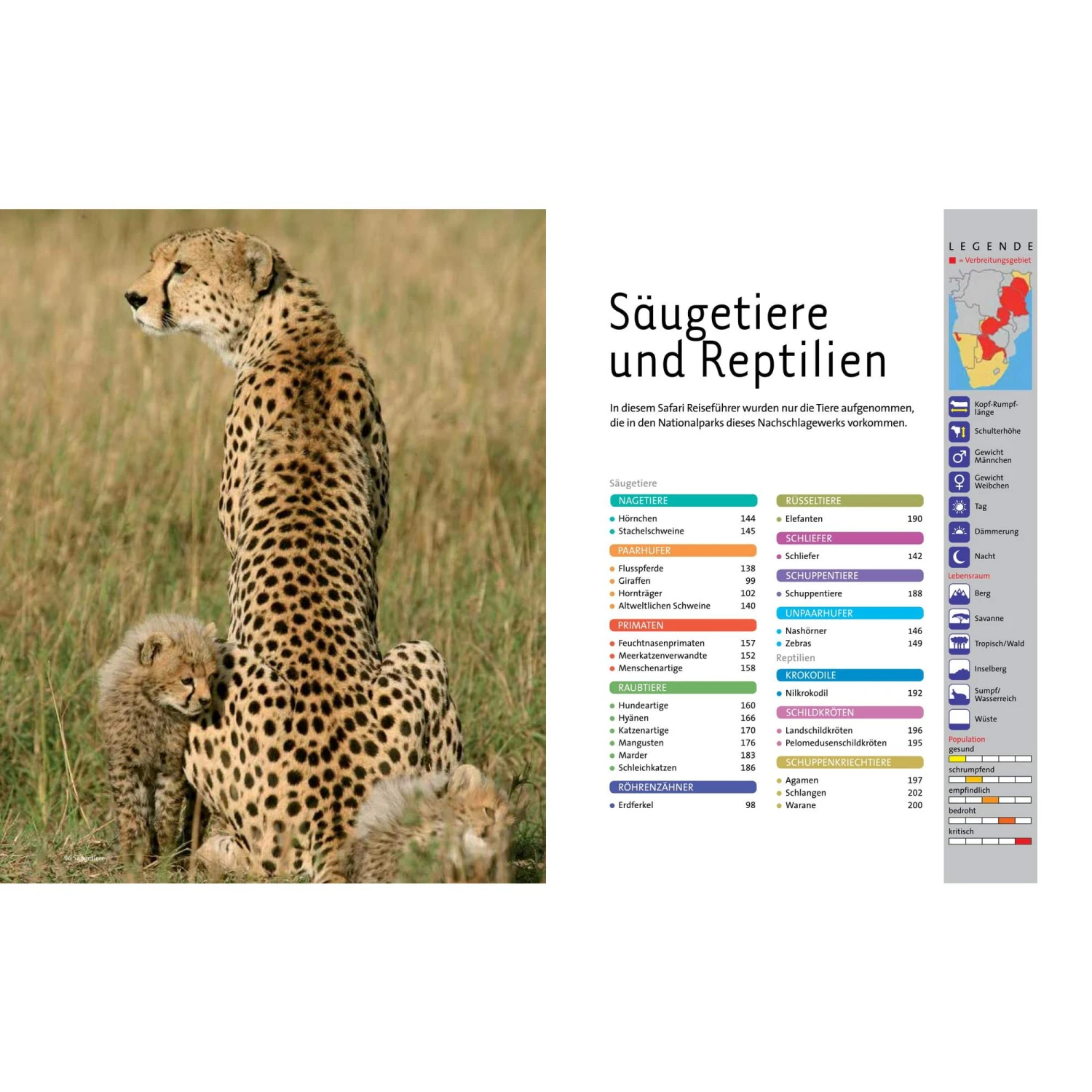 Von den über 600 Tierarten finden Sie den lateinischen, englischen und natürlich deutschen Namen. Das 400 Seiten umfassende Buch enthält des Weiteren Karten und Beschreibungen der wichtigsten Nationalparks, Erklärungen wichtiger Safaribegriffe, ein mehrsprachiger Index, Informationen zur Reisevorbereitung, Ausrüstung, Unterkünften und viele andere Themen.