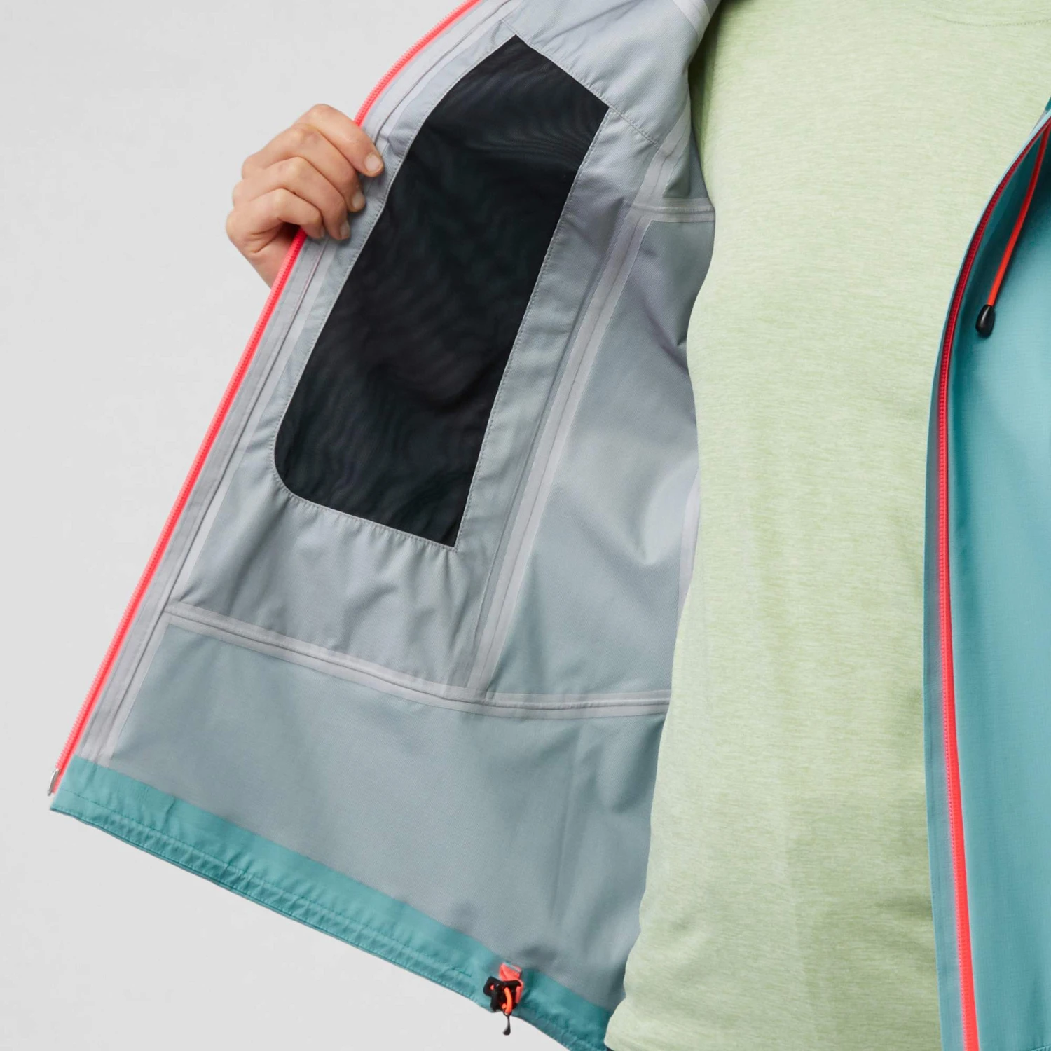 - Helmkompatible Kapuze mit Volumen-Regulierung (vorne und hinten)